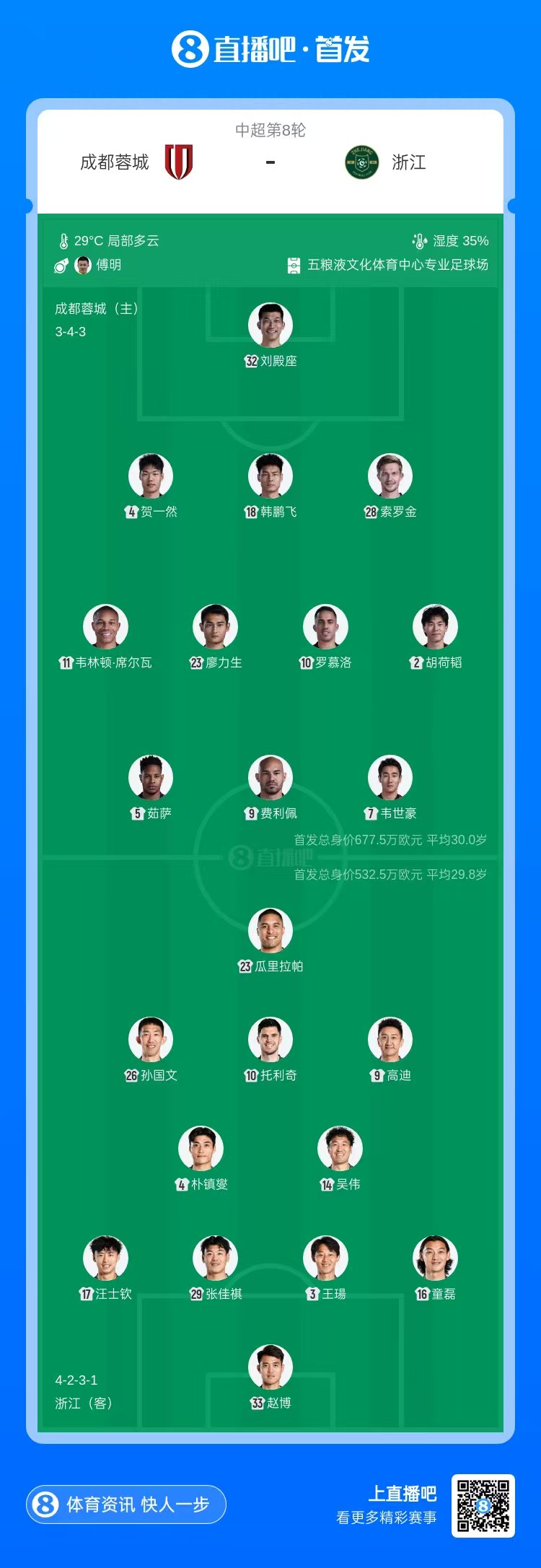 成都蓉城首发:32-刘殿座、2-胡荷韬、4-贺一然、18-韩鹏飞、28-索罗金(F)、5-马修斯·茹萨(F)、10-罗慕洛(F)、23-廖力生、7-韦世豪、9-费利佩(F)、11-韦林顿·席尔瓦(F)